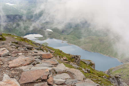 Snowdonia National Park, North Wales, United Kingdom; steps to the top, view of the mountains and the lakes, selective focus