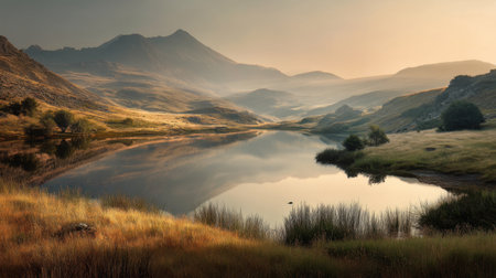 a river flows through the picturesque scottish landscape captured in this photo. with an 8k resolution, the image showcases a serene atmosphere with pastoral settings. the color palette features a combination of dark cyan and light amber, complemented by hints of light pink and amber. this photo is available under the creative commons attribution license. ai generated