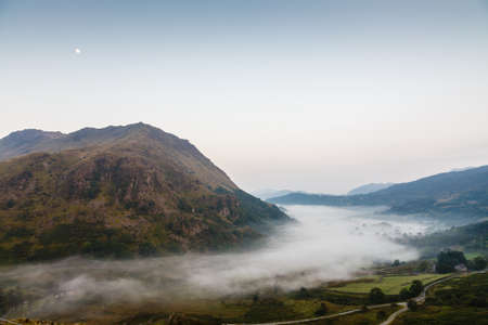 Beautiful landscape panorama of Miners Tack in Snowdonia National Park in North Wales, UK. Shoot during gloomy cloudy day with strong fog