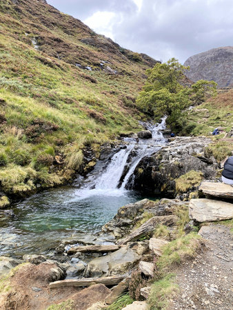 Early morning Carnedd Llewelyn, from path and lake or Llyn Idwal. Snowdonia national Park, Gwynedd, Wales, UK. landscape.