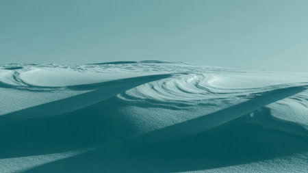 Undulating snowdrifts with subtle shadows under bright sunlight creating a textured winter landscape