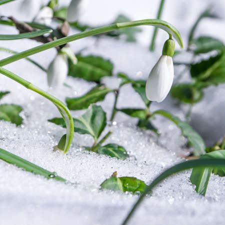 Snowdrop flowers (Galanthus nivalis) grow on snowy ground. Symbol of new life, spring and Easter holiday.