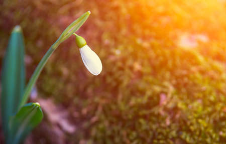 Lonely snowdrop flower reaches for a sunbeam in the morning