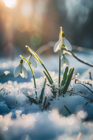 delicate beauty of the first snowdrop flowers emerging from melting snow. Ideal for celebrating the arrival of spring or creating an enchanting March 8th visual. Soft focus and vibrant blooms