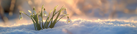 Snowdrops Blooming in Winter Snow at Sunrise Nature's Resilience and Beauty.