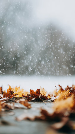 Colorful autumn leaves lay still on the ground while soft snowflakes fall gracefully, transforming the landscape into a peaceful winter scene.