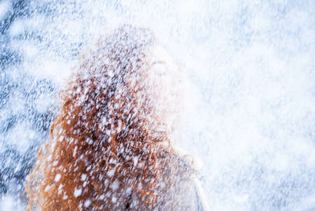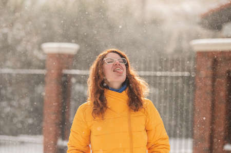 Red-haired Caucasian woman rejoices in winter and catches snowflakes with tongue.