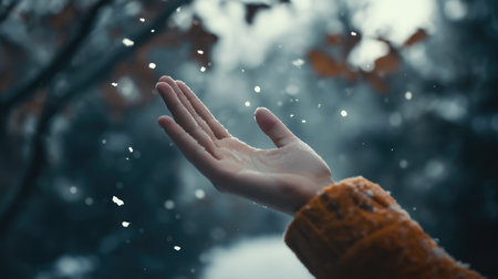 Extend your open palms to catch delicate snowdrops falling from the sky, a gentle moment of connection with nature's fleeting winter beauty.AI Generated