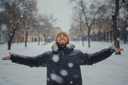 happy man enjoing snow in park