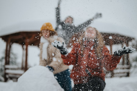 Group of friends enjoying a playful snowball fight in a picturesque wintry setting