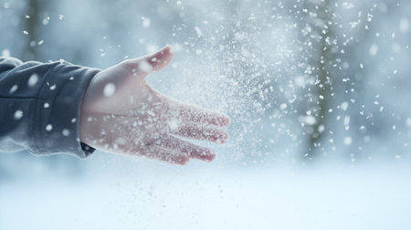 Hand Reaching for Snowflakes in Winter Scene