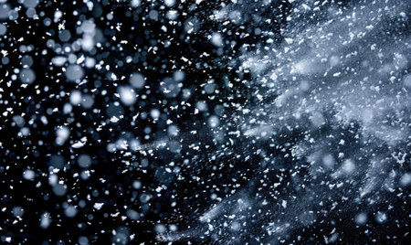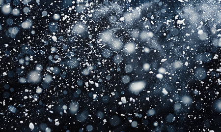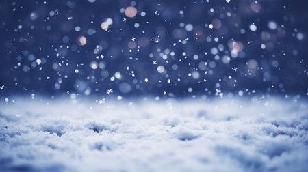 Photography captures dense snowfall against a rich navy night sky, showcasing high contrast and crisp white flakes, evoking a tranquil winter ambiance with copy space