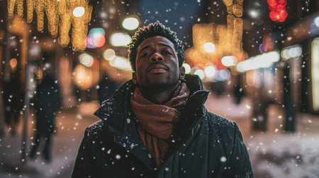 A man stands still as soft snowflakes fall around him capturing the spirit of Christmas with winter decorations in the background.