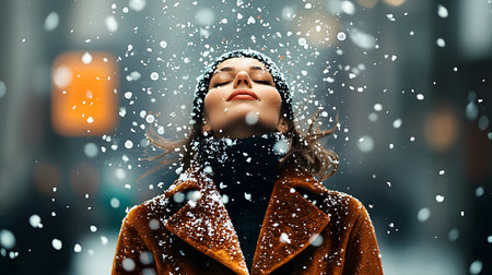 beautiful young woman in winter coat and scarf under falling snowfall