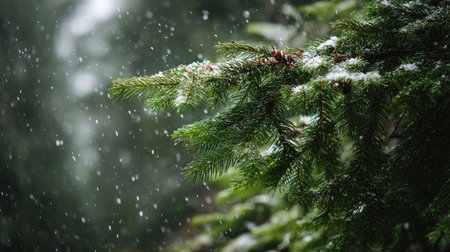 A close up of a pine tree with snow falling on it, AI