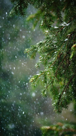 First snow falling gently on Fir, a few snowflakes drifting slowly and settling on the leaves; fresh air, natural.