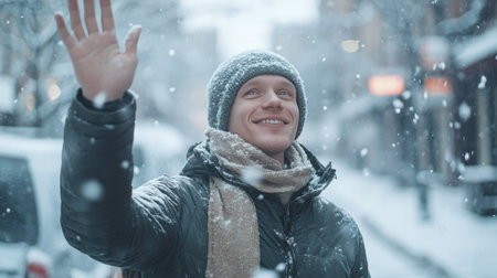 A man in a jacket and scarf waving goodbye in the winter, surrounded by snow and cold weather