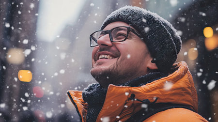 Young man enjoying a snowy evening with festive lights in an urban setting during winter