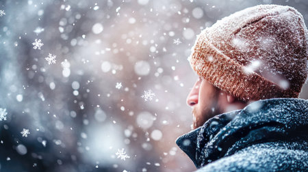 A serene winter scene featuring a man in a cozy hat surrounded by falling snowflakes. The soft focus background enhances the tranquil atmosphere of the cold season.
