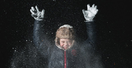 Photo of a boy in winter clothes in the evening in snowy frosty weather, playing in the dark