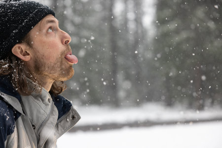 A man with a black hat and beard is sticking his tongue out in the snow. Concept of humor and playfulness, as the man is making a silly face in the midst of a snowy landscape