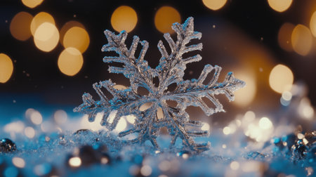 Close-up of snowflake with bokeh lights, winter wonderland atmosphere