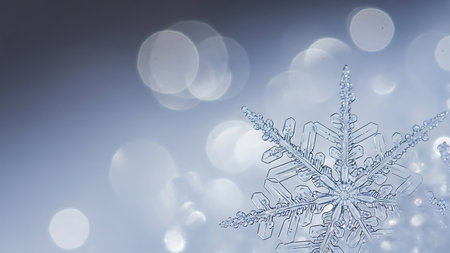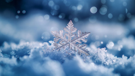 A serene winter landscape featuring a delicate snowflake resting on soft snow, complemented by a beautiful bokeh lighting effect in blue and white.