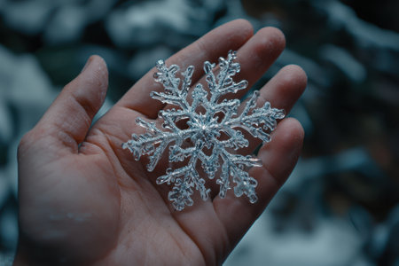 A hand holding a snowflake made of clear plastic. The snowflake is small and delicate, and the hand is holding it gently. Concept of wonder and appreciation for the beauty of nature