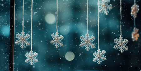 Christmas banner with hanging snowflakes sparkling in the sunlight and creating a magical winter atmosphere.