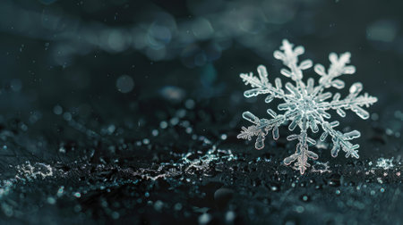 A single, intricately detailed snowflake rests on a dark, textured surface, surrounded by smaller ice crystals and particles, with a softly focused background that gradates from light to dark, creating a serene and ethereal atmosphere.