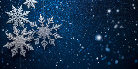 A detailed close-up of glittery snowflake decorations scattered on a dark blue surface, evoking winter and holiday vibes.