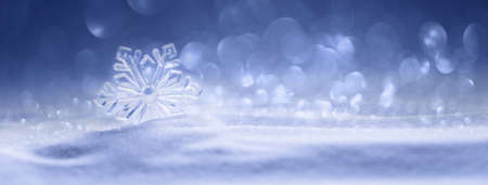 Snowflake on snow background with bokeh lights. New Year and Christmas concept.