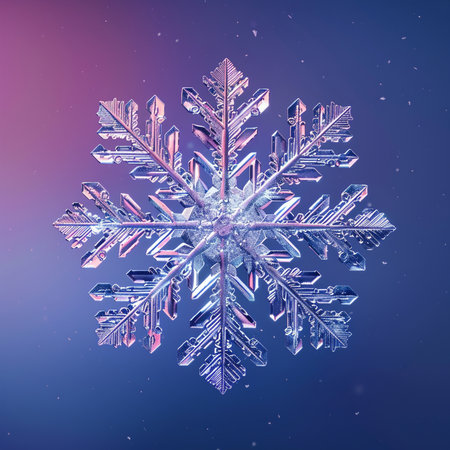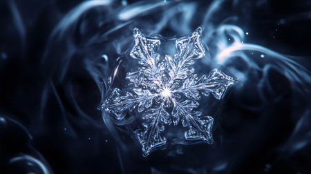 Intricate snowflake shapes shimmer in glowing icy hues, capturing the essence of winter's delicate beauty and frost's enchanting charm.