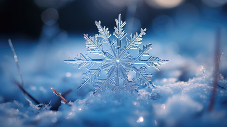 A single, perfect snowflake captured in stunning macro detail, its intricate crystalline structure glowing against a deep blue, sparkling background. This image evokes a sense of wonder, uniqueness, and the delicate, fleeting beauty of winters artistry.