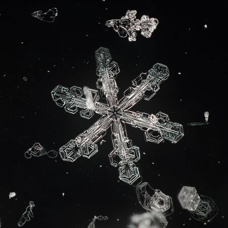 large stellar dendrite with large hexagonal symmetry, ornate ornate arms and beautiful relief pattern.