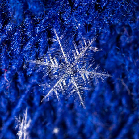Real snowflake on blue background. Christmas winter snowflakes background. Snowflake Closeup. Macro photo.
