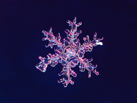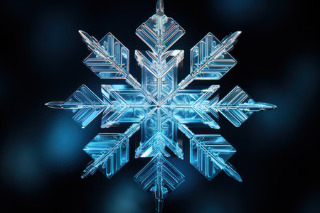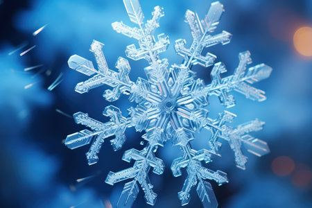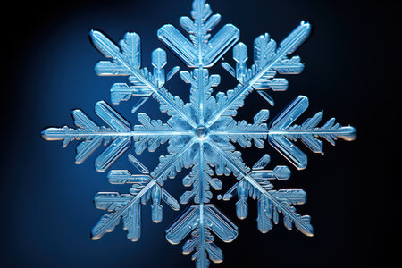 Macro photograph showing the intricate details of a single snowflake against a dark blue background. A stunning display of winter's beauty