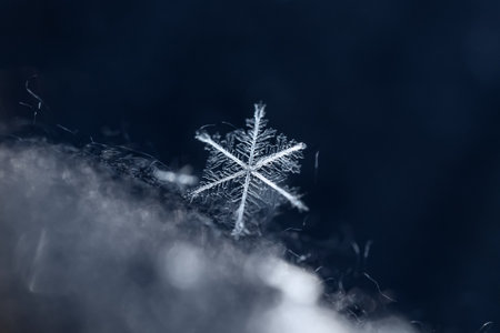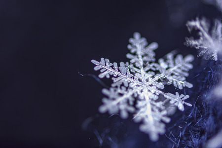 Snowflake on a dark blue background. Macro photo with shallow depth of field.
