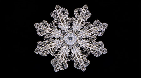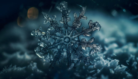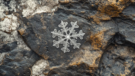 A mesmerizing close-up of a single, intricately snowflake resting on a dark surface. Perfect for winter themes.