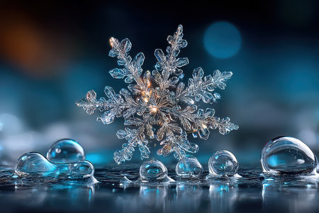 A delicate snowflake is positioned among droplets, capturing light against a dark and shimmering blue backdrop.