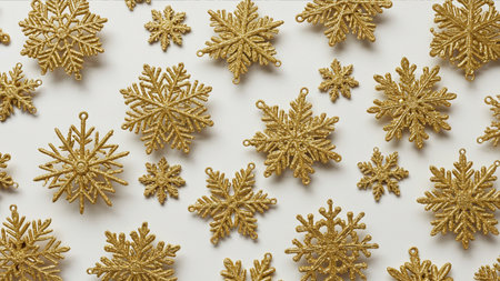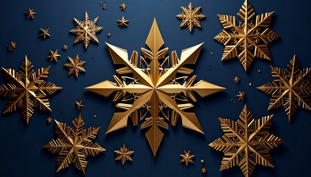 Delicate golden snowflakes and sparkling crystals rest on a rich blue surface evoking winter charm.
