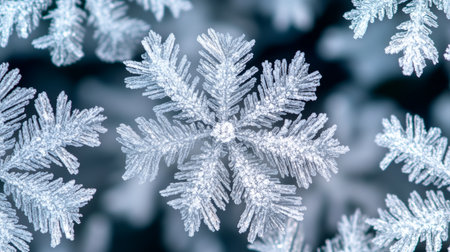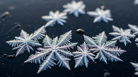 Macro close-up of intricate natural ice crystal snowflakes with detailed patterns on a dark surface