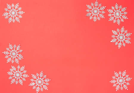 Silver sparkly snowflakes Christmas decorations on the bright red background, copy space, selective focus