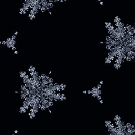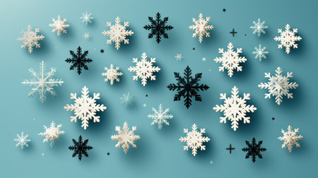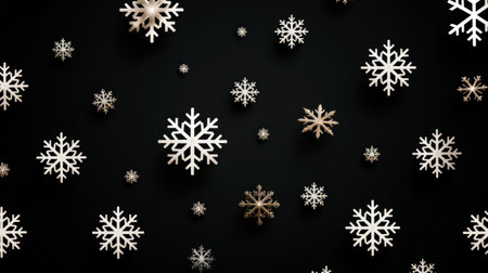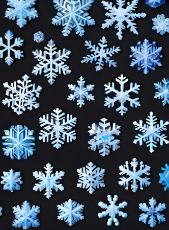 A captivating collection of unique snowflake designs scattered on a black background, showcasing intricate patterns and delicate textures for winter aesthetics.