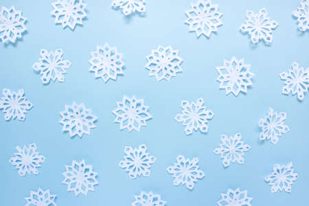 Festive Christmas pattern with white paper handmade repeating snowflakes blue background.
