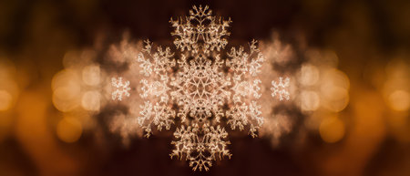 This New Year scene showcases a stunning symmetrical snowflake pattern surrounded by soft dreamy bokeh lights evoking warmth and joy.