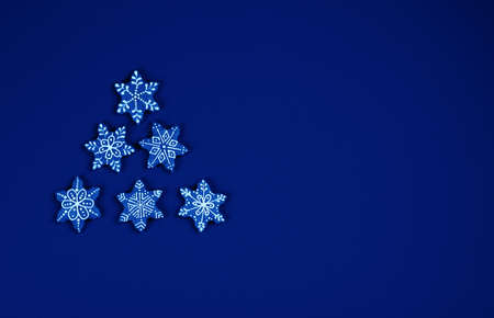 Christmas gingerbread cookies in the form of snowflakes are decorated with a beautiful pattern, laid out in the form of a Christmas tree on a blue background. Flat lay