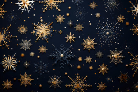 Golden Christmas snowflakes background with gold glitter on black. Generative AI