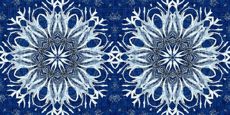Indigo blue snow flake border background. Frosty batik painterly effect seamless edging. Festive cold holiday season ribbon.