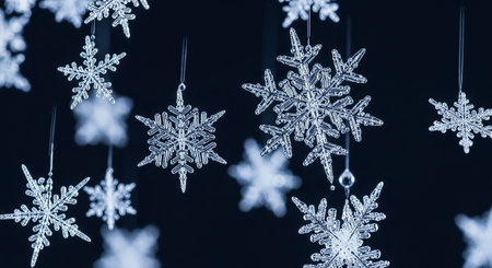 Delicate snowflakes intricately layered against a dark backdrop, showing their unique forms and the essence of winter's chill.